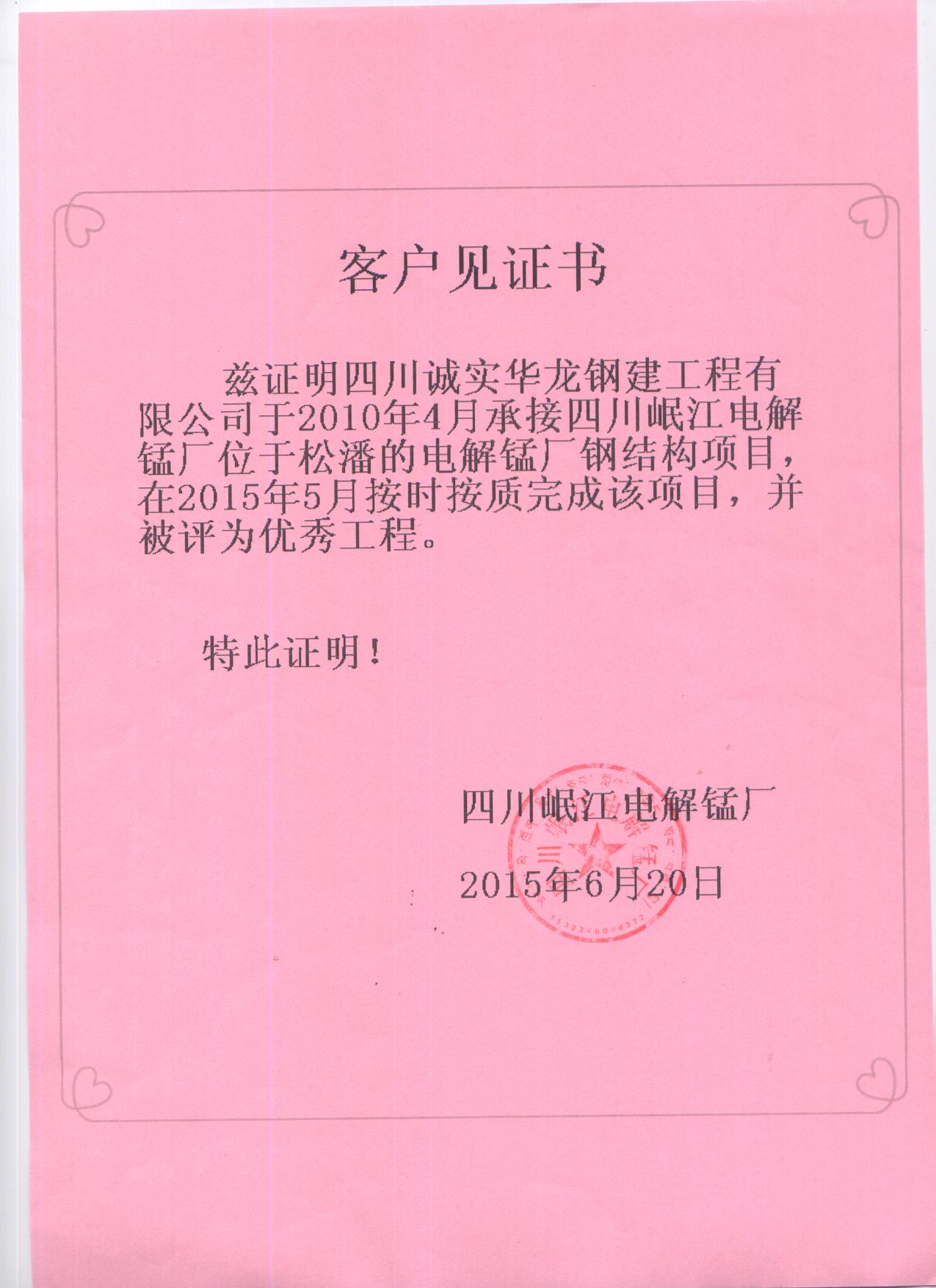 電解錳廠客戶見證書